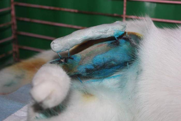 - Раны. Эти механические повреждения характеризуются нарушением целостности кожи и слизистых оболочек. К ним относятся травмы ушей, глаз, а также раны на боках и лапах. В зависимости от причины и локализации раны различают резаные, ушибленные, размозженные, кусанные и колотые раны. При попадании токсических веществ в открытую рану могут развиваться серьезные осложнения.