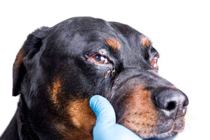 - Аллергическая реакция. Аллергия у собак возникает из-за многих факторов, таких как продукты питания, пыль, пыльца растений, синтетические материалы, лекарства, шампуни или какие-то химикаты, к которым животное случайно получило доступ. Обычно гной является лишь одним из симптомов аллергии, и заметить ее достаточно просто, а вот выяснить ее причину, наоборот, сложно. Так что если вы видите, что у собаки опухли глаза и появился гной, необходимо сделать анализы и определить аллерген. Только его полное устранение поможет справиться с проблемой.