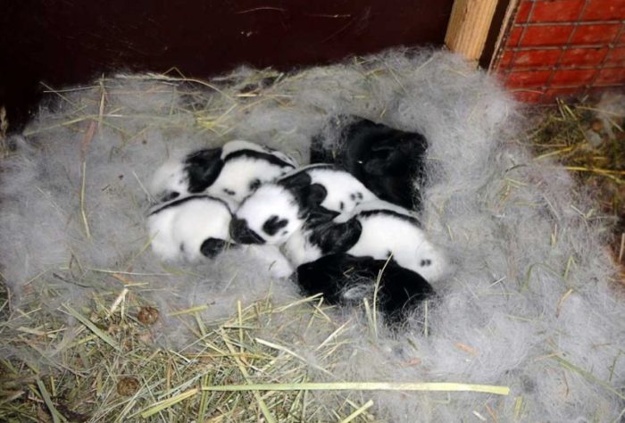 Важно, чтобы крольчата не отползали от матери. Если такое произошло, то наденьте перчатки и подтолкните малыша назад