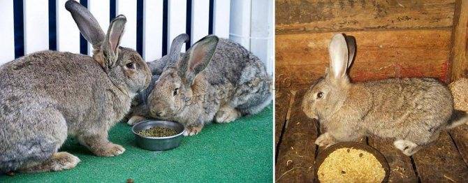 Молодняк растет очень быстро. Стремительный рост будет при наличии полноценного калорийного корма. Кролики едят овощи, сено, зерно. Выпускают специальный кроличий комбикорм. Самое главное – это обеспечить регулярную подачу еды. Пропуски кормления пагубно влияют на работу пищеварительной системы серых великанов.