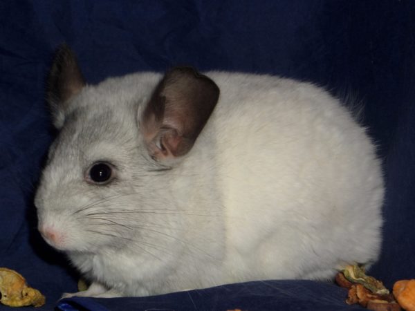Шиншиллы имеют снежно-белый мех с черным напылением на концах шерстинок. Конечности, голова и основание хвоста могут иметь бежевый оттенок.