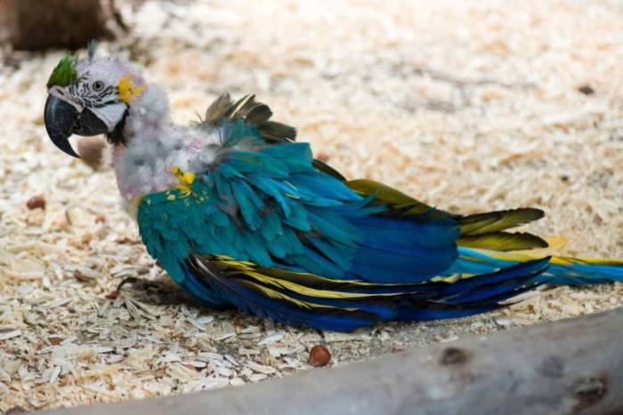 - Внешний вид попугая становится менее привлекательным (на теле видны участки без перьев и пуха).