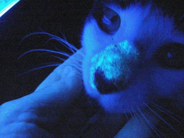 2Проводит обследование лампой Вуда. Эта флуоресцентная лампа есть в любой ветеринарной клинике. Этот инструмент диагностики излучает свет в ультрафиолетовом спектре, под которым светятся пораженные грибком участки кожи.