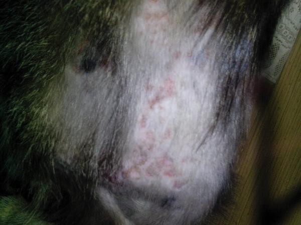 - шерсть в зонах проявления сыпи становится редкой, волоски начинают ломаться;