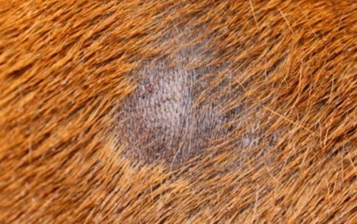 Поверхностную форму заболевания – на коже появляются ограниченные пятна с обломанными, взъерошенными волосами, в дальнейшем шерсть на этих участках выпадает, а кожа краснеет и шелушится.