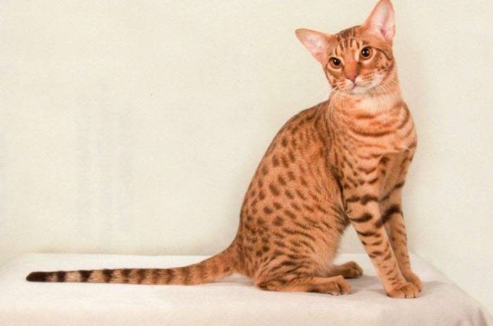 Вирджиния решила продолжить селекционные работы по скрещиванию этих двух пород кошек. Но во втором помете абиссинцев и сиамов, неожиданно для самой заводчицы, родился пятнистый котенок, который кардинально отличался от остальных малышей. Необычного котенка с пятнистым окрасом и янтарно-желтыми глазами назвали Тонга, но дочь Вирджинии дала ему имя оцикет, ведь он очень напоминал своим внешним видом диких кошек оцелотов.