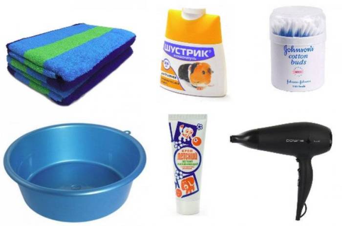 - полотенца. Одно — для того, чтобы завернуть и высушить животное, а другое — для укладки на дно таза, чтобы лапки свинки не скользили;