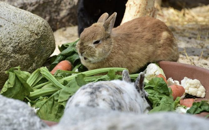Рацион кроликов должен включать все группы кормов: грубые, сочные, концентрированные, витамины и минералы. Допускается уменьшать количество концентратов, овощей и фруктов для животных в состоянии покоя.