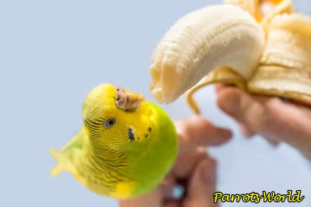 Птицы с осторожностью пробуют что-нибудь незнакомое, поэтому нужно набраться терпения, дождавшись, пока попугай попытается откусить от плода кусочек. Обычно пернатые любят грызть фрукты от большого ломтика и откусывать большие кусочки. Поэтому удобно кормить птицу банановым плодом, подвесив его сверху домика или прикрепив к держателю