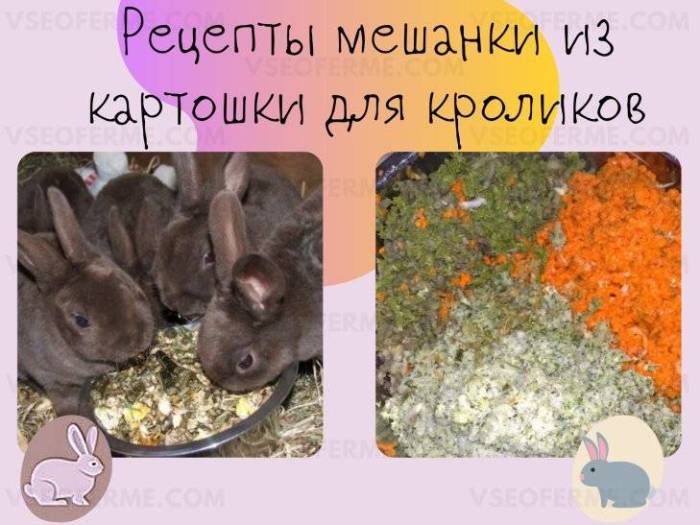 Существует множество рецептов для приготовления мешанки с корнеплодами. Обычно в состав мешанки входят пять частей картофеля и четыре части комбикорма для кроликов. Завершающим ингредиентом служит сочный корм, который может быть представлен ошпаренной крапивой или мелко нарезанной капустой. Все компоненты тщательно перемешиваются, и при желании можно добавить немного растительного масла.