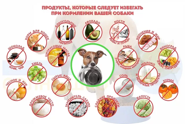 Собакам нельзя давать остатки с нашего стола, лук, чеснок, специи, капусту, вареный картофель, кости, бобовые, сырой яичный белок, сладости, печеное, соленое, жирное и копченое. Запрещены конфеты, сосиски и колбасы.