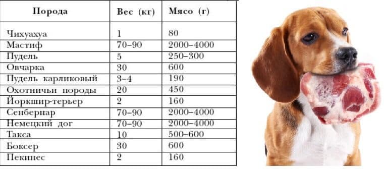 С помощью таблицы можно легко определить необходимую суточную порцию мяса для собак.
