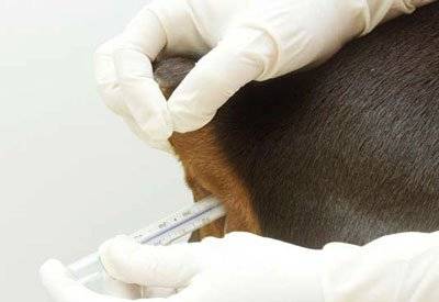 - Собаке приподнимают хвост и бережно вводят кончик градусника в анус на глубину 1,5-2 см, бережно и неспешно, избегая усилий. Если собака напрягает мышцы, то следует немного выждать, чтобы не травмировать слизистую оболочку.