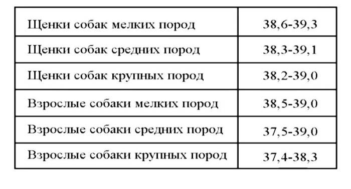 - для крупных пород (немецкая овчарка, сенбернар, мастиф и т.д.) – от 38,2 до 39,2°С.