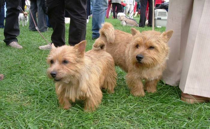 Плечи слегка отведены назад, локти прижаты к грудной клетке. Запястья находятся под углом по отношению к поверхности точки опоры. Бедра крепкие, колени находятся под естественным углом, что говорит о силе, которой наделена порода. Уши маленькие, с заостренными концами. Порода схожа с норфолк-терьерами, но главное отличие — стоячие уши.