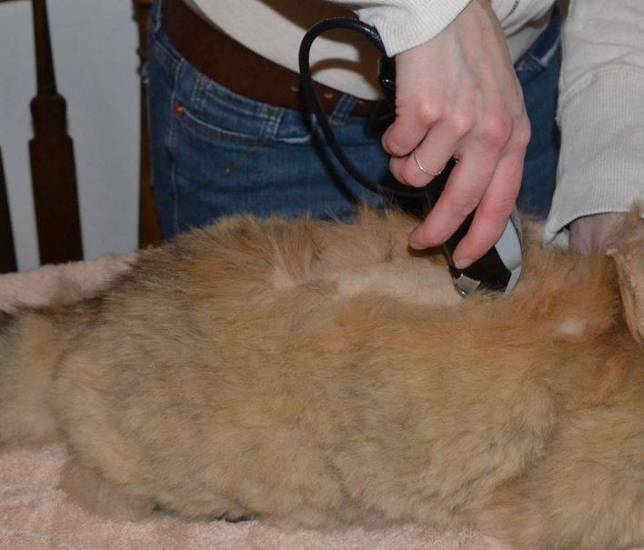 Потом берут металлическую расческу и проводят по шерсти, останавливаясь так, чтобы часть волосков осталась на ней. Аккуратно срезают их. Получается ровная полоска нужной длины и остается только повторить ровно ту же процедуру по всему телу.