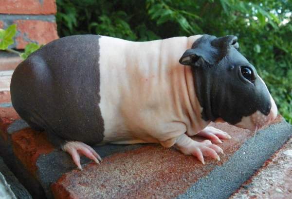 - Морская свинка Скинни появляется на свет полностью голой и остается такой всю жизнь. Немного волоса остается на конечностях и мордочке.