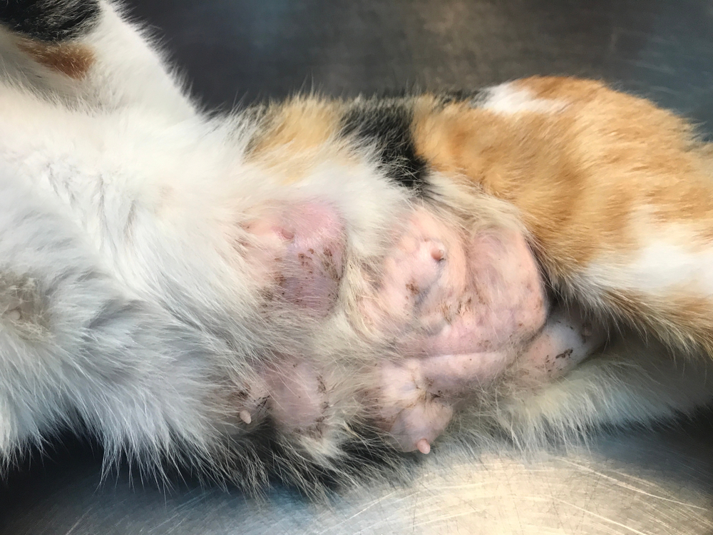 На ранних этапах заболевания у кошки могут отсутствовать явные симптомы, за исключением небольших образований в области живота, которые зачастую остаются незамеченными хозяевами.