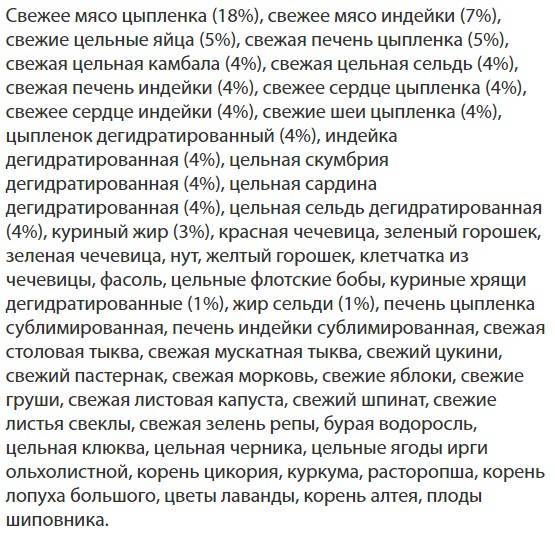 - Разнообразие мясных ингредиентов – козлятина, баранина, мясо утки, оленя и кабана. Также в состав входят филе морской рыбы (голец, сардина, треска) и внутренние органы (почки, печень, сердце). Белковый состав представлен как свежими, так и дегидратированными продуктами.