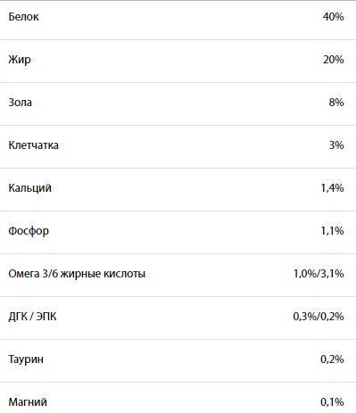 | Основные ингредиенты | Высокое содержание свежего мяса (курица, индейка, рыба), субпродуктов и хрящей. | 60-70 г в день |