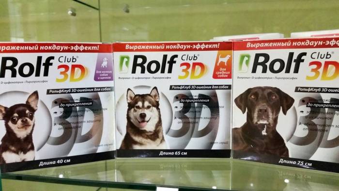 Rolf 3d. Подходит для собак всех размеров. Предназначен для защиты от блох и клещей. Отличается низкой токсичностью компонентов. Заявленный срок действия — 4 месяца. Противопоказан щенкам младше 3 месяцев, а также больным, беременным и кормящим собакам. Средняя стоимость — 390 руб.
