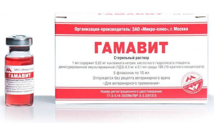 Гамавит — это комплексный препарат, включающий в себя достаточно широкий спектр разнообразных витаминов, аминокислот, неорганических солей и других компонентов, который оказывает широкое действие, в частности, иммуномодулирующее, реабилитирующее после разнообразных травм и применения антибиотиков, а также помогает организму животных справиться с интоксикациями разнообразного генеза. Данный препарат также очень часто применяют с целью повышения работоспособности крупных скелетных групп мышц животных, а также увеличения устойчивости животных по отношению к разнообразным физическим нагрузкам.