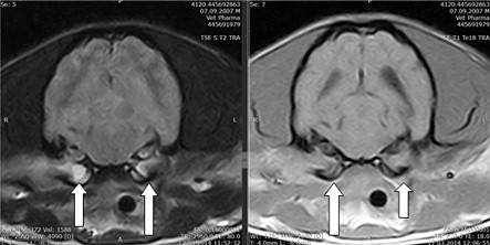 При наружном или среднем отите необходимо назначить системное лечение. Применение кортикостероидов помогает снизить воспалительные процессы и уменьшить выработку секрета в барабанной полости и наружном слуховом канале. Информация о назначении антибиотиков и противогрибковых средств в системной терапии является противоречивой; такие препараты следует использовать индивидуально, основываясь на результатах посева и тестирования на чувствительность к антибиотикам, а также принимая во внимание степень тяжести заболевания и возможность владельца проводить местные процедуры. Системные фторхинолоны рекомендуется назначать в дозировке, соответствующей верхней границе установленного диапазона, поскольку их эффективность зависит от концентрации (то есть важнее достичь пика концентрации, чем поддерживать препарат на уровне выше минимальной ингибирующей концентрации). Использование доз ниже терапевтических значений с высокой вероятностью приведет к отбору микроорганизмов с повышенной устойчивостью. Кроме того, применение противовоспалительных доз глюкокортикоидов (0.5 мг/кг/день) в течение первых 5-7 дней терапии может помочь снизить воспалительные изменения в вестибулокохлеарном, лицевом или симпатических нервах.