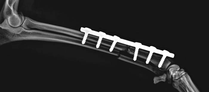 Через 4 — 5 недель после остеосинтеза животному назначается контрольная рентгенография с целью оценки эффективности операции.
