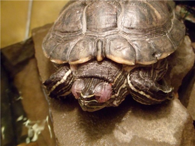 Причиной, по которой красноухие черепахи могут не открывать глаза и испытывать отеки век, могут быть пневмония и сложный ринит.