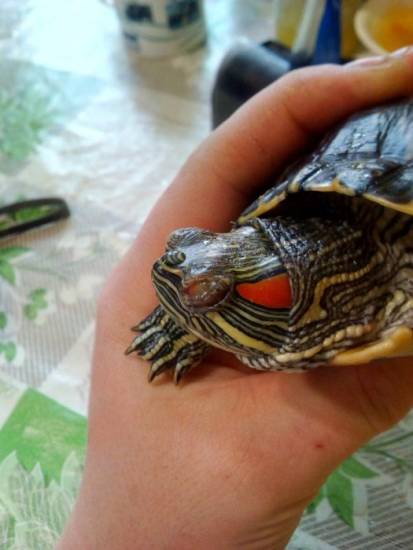 Лечение воспаленных глаз красноухой черепахи невозможно без закапывания глазных капель, нанесения мази и удаления гноя с помощью ватной палочки. Однако рептилия может сопротивляться таким процедурам – она может попытаться укусить или спрятать голову в панцирь. Упростить задачу можно следующим образом: