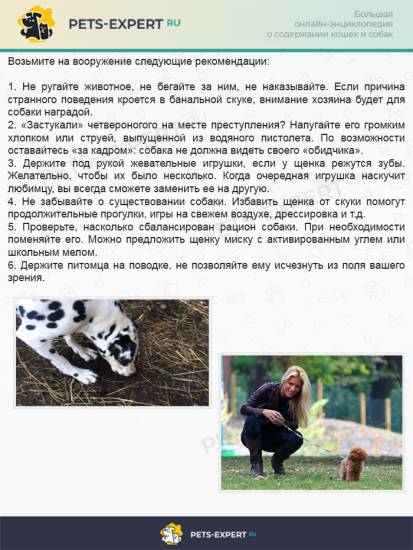 Прежде всего, необходимо разобраться в причинах такого необычного поведения. Не следует кричать на щенка или взрослую собаку, применять физическое наказание. Вместо этого лучше предпринять следующие шаги: