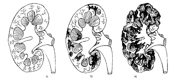 А) Здоровая почка; Б) начальная стадия поликистоза почек с незначительными изменениями в паренхиме, проявляющимися в виде мелких кист; В) конечная стадия поликистоза, когда паренхима полностью заменена кистозными образованиями.