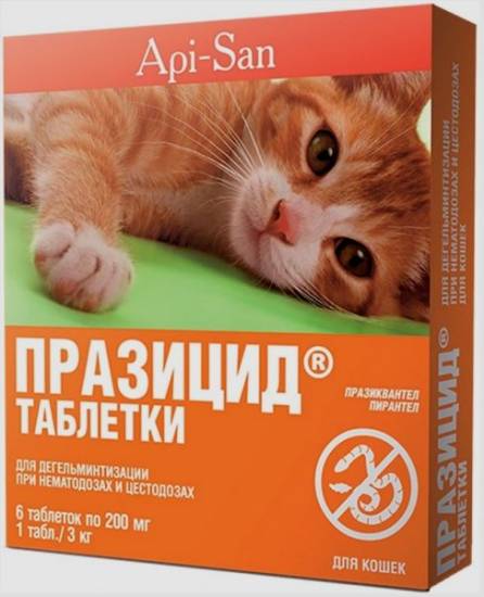 Таблетки и суспензия содержат празиквантел и пирантела памоат, предназначенные для борьбы с нематодами и цистодами. В состав суспензии также входит фенбендазол — препарат комбинированного действия против всех видов глистов. Капли на холку включают вещества, уничтожающие глистов (ивермектин, левамизол, празиквантел), а также наружных паразитов (тиаметоксам). | Применяется однократно, дозировка зависит от возраста и веса животного. При сильном заражении — повторение через 14 дней. Ограничения по применению аналогичны Прателу, но беременным и кормящим кошкам не рекомендуется. Суспензию Празицид можно давать котятам с трёхнедельного возраста, другие формы — только с двухмесячного. | После применения препарата тщательно вымыть руки с мылом и в течение двух суток нежелателен близкий контакт с животным. Иногда применение этого лекарства имеет побочные явления: