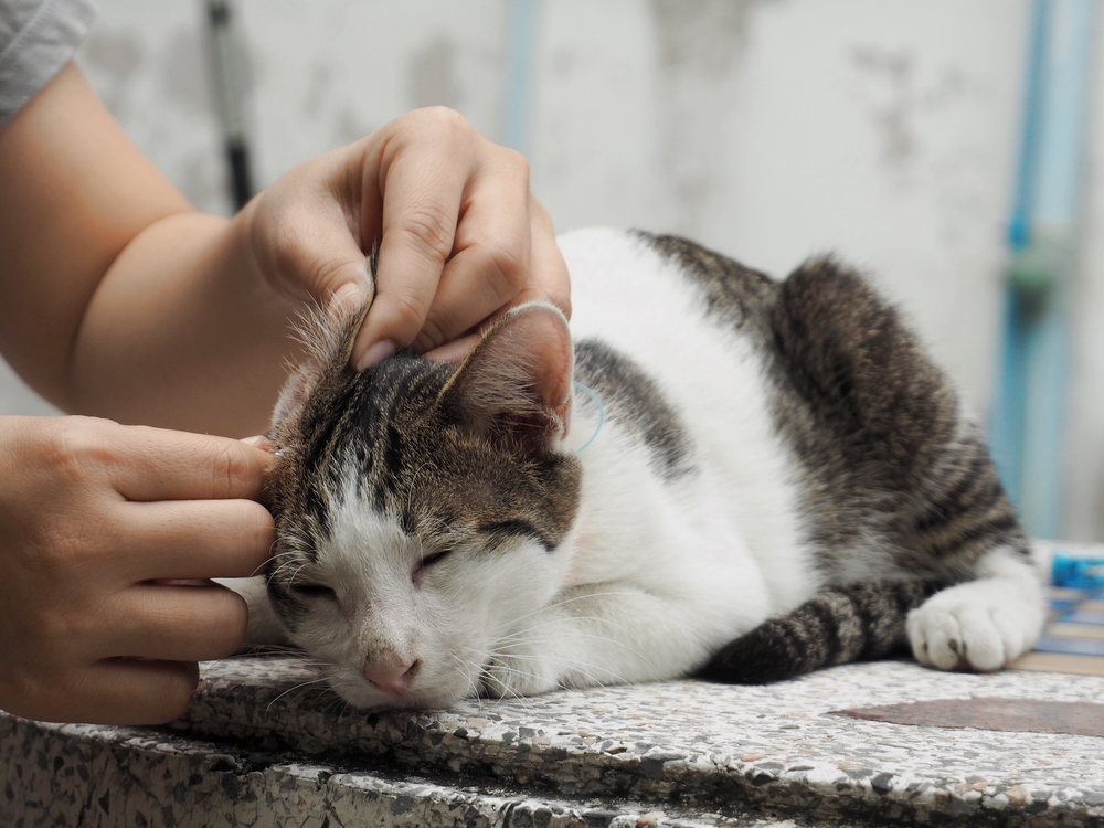 - После завершения процедуры отпустите кота и отойдите в стороны – он будет активно трясти головой, избавляясь от лосьона. Затем аккуратно протрите наружную часть уха с помощью салфетки или ватного диска.