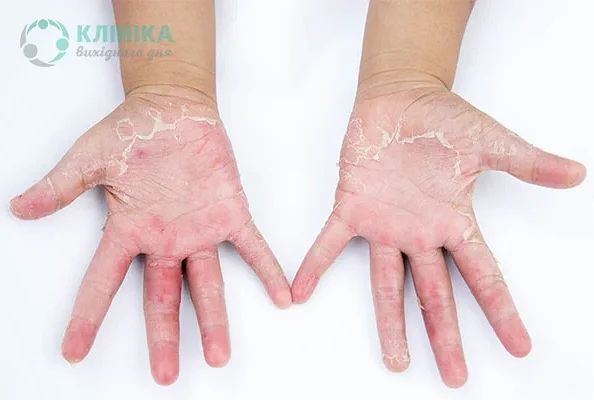 Среди симптомов можно выделить: зуд, покраснение кожи, шелушение, пузырьки, трещины, образование корки на коже, а также изменение цвета и текстуры кожи.
