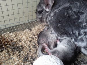 Самка чистит его шерстку, вылизывает, приучает к чистоте. Также мама стимулирует гениталии детеныша, чтобы «запустить» механизмы испражнения в организме. При этом мама заботливо кряхтит, а зверек счастливо попискивает. Наблюдая за малышами шиншилл, можно увидеть некое сходство в поведении с малышами человека.