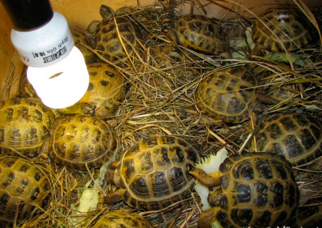 - Пол для малышей рекомендуется застилать опилками. Температурный режим должен быть таким же, как и для взрослых черепах, аналогично и освещение.