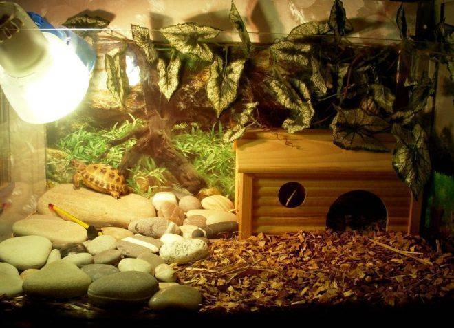В укрытии для черепахи, расположенном в теплом углу, рекомендуется насыпать гальку и разместить плоские камни. Эти элементы помогут рептилии стачивать когти. Кроме того, черепахи любят забираться на камни и греться под лампочкой.
