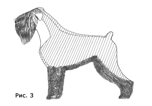 Внутренняя часть шеи стрижется коротко (0,5-0,7 см) от места соединения нижней челюсти с шеей до грудной кости (киля), а также от основания уха до лопатки, формируя так называемую “манишку”. Линия, проведенная от киля вдоль лопатки, будет служить границей между короткой шерстью на нижней части шеи и более длинной, которая находится чуть ниже лопатки и на плечах. Не рекомендуется делать эту границу резкой. Все линии стрижки должны плавно переходить одна в другую, избегая излишней вычурности, характерной для декоративных пород. Правильно оформленный фронт должен подчеркивать линию плеча и создавать ощущение динамики и устремленности вперед. Линия фронта плавно опускается вниз. Длина шерсти на корпусе (на рисунках обозначена косой штриховкой) варьируется от 3 до 7 см в зависимости от физического состояния собаки и типа шерстного покрова. Вдоль нижней части корпуса длина шерсти немного увеличивается, плавно переходя вниз и образуя “юбку” вдоль груди и живота. Четкая линия, опускающаяся немного ниже локтя груди и переходящая в умеренно подтянутый живот, придает особую выразительность хорошо сложенной собаке. Линия верха должна плавно опускаться от основания шеи до хвоста, подчеркивая выраженность холки.