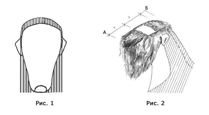 Уши коротко стригутся с внешней и внутренней сторон. С внешней стороны полотна уха оставляется 0,5 см, края аккуратно выравниваются ножницами. На лбу, начиная от надбровных дуг, коротко (0,5 см) выстригается (можно машинкой) прямоугольная площадка длиной до переднего края уха, по ширине равная (или чуть меньше) ширине черепа. Переход от лба к затылку стрижется ножницами так, чтобы получился плавный переход от коротко стриженых волос до длинных (3-5 см) на затылке, где более длинные волосы образуют “шапочку”. Скулы должны быть плоскими. Сама голова после стрижки при взгляде сверху должна иметь форму “кирпича” (пропорции от мочки носа до надбровных дуг и от надбровных дуг до затылочного бугра указаны на рис. 1.), при взгляде сбоку – форму треугольника (рис. 2). Линия челки должна быть естественным продолжением лба, подчеркивая его прямолинейность и параллельность спинке носа.