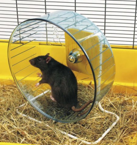 Колесо — один из самых популярных аттракционов для крыс, так как бег в нем удовлетворяет их естественную потребность в движении. В клетке это сделать практически невозможно. Затратив немного времени и используя простые материалы, которые можно найти в любом доме, его можно изготовить самостоятельно. Если у владельца нет необходимых навыков, такое приспособление легко приобрести в зоомагазинах.
