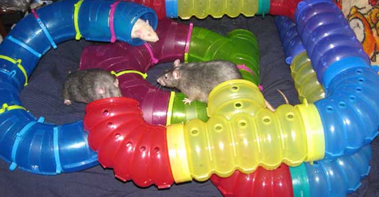 Каждая клетка для крысы или мыши также должна содержать различные домики, укрытия и туннели, в которых животное может прятаться. Такие приюты дают питомцу чувство безопасности и позволяют спокойно отдыхать. Строительство и движение по коридорам и туннелям — игра, полностью увлекающая большинство грызунов, поэтому нужно позаботиться о том, чтобы в их окружении были и такие игрушки. Существуют модели лабиринтов в виде труб, которые можно без труда перестраивать или расширять, добавляя дополнительные коридоры для усиления сложности их преодоления.