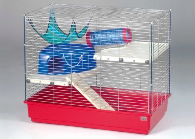 На данном фото представлен заводской вариант исполнения крысиной клетки. По схожему принципу можно обустроить самодельный эквивалент жилища для грызуна. Данная модификация предполагает наличие двух этажей. На одном из них установлен мини-домик, имитирующий нору. Имеется тоннель, открывающий доступ к тканевому гамаку, расположенному над норой. Доступ к ярусам обеспечивается за счет специальных лесенок.