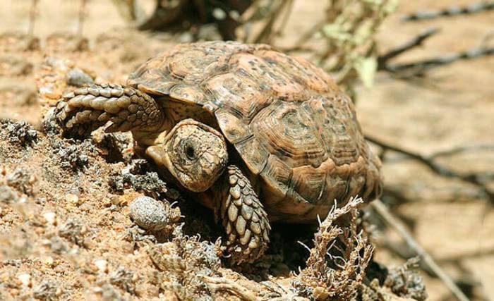 Сухопутная черепаха-черепашонок (Homopus signatus): Эта черепаха, обитающая в Южной Африке, является одной из самых маленьких сухопутных черепах в мире. Взрослые особи обычно достигают длины всего 10-15 см и весом около 0,5-1 кг. Они имеют характерный куполообразный панцирь и ведут скрытный образ жизни, предпочитая сухие и каменистые местности.