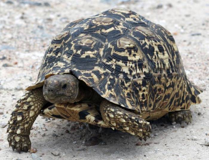 Среди сухопутных видов звание самой маленькой принадлежит крапчатой плоской черепахи или ее еще называют намаквалендской рептилией. Узнать ее достаточно просто по характерному окрасу панциря, его бежевый оттенок покрывают темные крапинки. Размеры данного животного не превышают десяти сантиметров. У крапчатой плоской черепашки имеются бедренные шпоры, а от других видов ее отличают еще количество пальцев на передних лапах. Их у нее пять, тогда как у других всего четыре. Питаются рептилии растительной пищей, мало кто знает, но больше всего они предпочитают ягоды красного и желтого цвета.