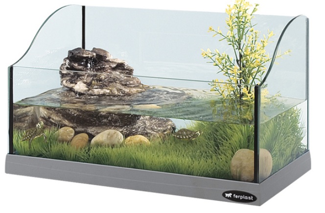 - Только половина теплицы залита водой; на дно аквариума необходимо установить специальные грубые камешки или ветки, чтобы черепаха имела возможность ползать по земле в виде островка, который необходим для ее обустройства.
