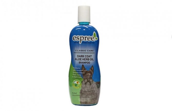 10. «Espree Dark Coat Aloe Herb Oil» 355 мл – 750 р Препарат бережно очищает темную шевелюру собаки, заставляет ее сиять, приятно пахнуть. Структура волоса становится эластичной, плотной, что делает его сильным, крепким. Содержит растительные вещества: сок алоэ вера, масла эвкалипта, кедра, цитронеллы, жожоба.