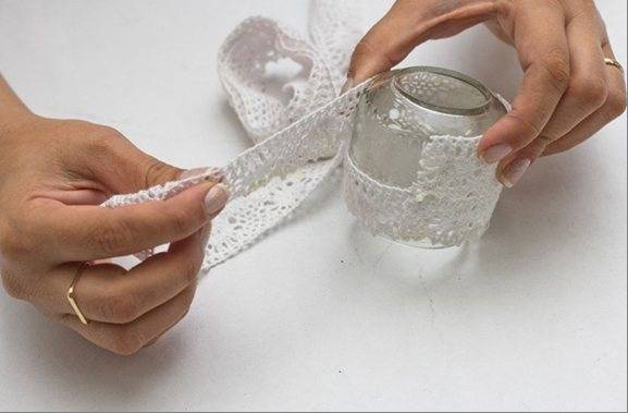 Стеклянная банка, катаясь по полу, будет сильно стучать, этот звук не понравится вашему пушистику. Чтобы приглушить звуки, баночку надо обклеить тесёмкой с имитацией кружева: так и звук будет не такой грохочущий, и видимость частично сохранится.