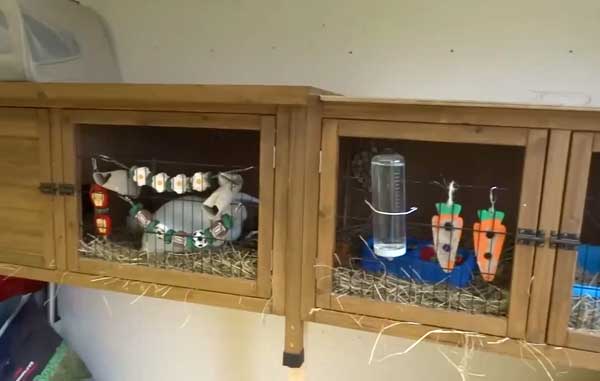 Каждая клетка должна содержать поилку, углубление из сетки для сена, металлические ёмкости для зерна, соломенные маты. Кроме того, в клетках следует оборудовать освещение, чтобы в тёмное время суток можно было без труда добавить пищу в ёмкости или произвести уборку.