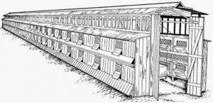 Одноярусные шеды представляют собой длинный навес с проходом посередине, по обе стороны от которого располагаются ряды клеток. В этом случае размеры клеток составляют 90, 70 и 40 см. Крыша такого шеда имеет двухскатную форму. В двухъярусных конструкциях проход также находится посередине, но по обе стороны от него расположены два ряда клеток в два яруса. Как и в первом варианте, крыша здесь двухскатная и оборудована продольной фрамугой с обеих сторон для освещения.